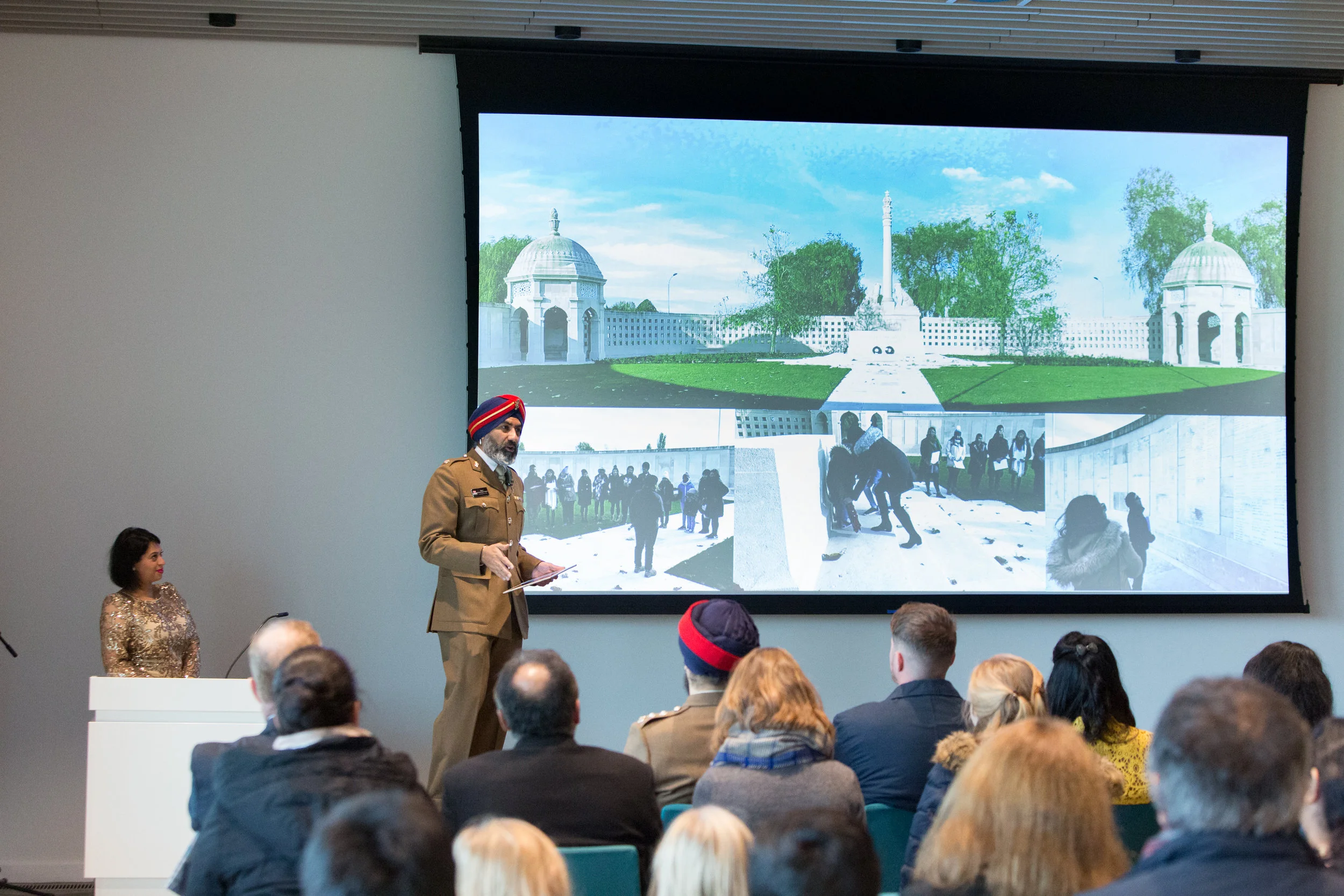 We started the morning attending a remembrance service at the Sikh Memorial, hosted by Captain Sohal. At 11am there was a two minute silence which we all held and then gave the members either a Poppy or a small token to lay at the memorial statue. After the service we headed to the newly built Aspects conference centre where we would unveil the exhibition. At the unveiling we had students speak to the audience of what this project has taught them and why they wanted to be involved. It was wonderful to hear that we had made a difference in informing them of histories that they did not know about. Two of the students spoke about how this project equipped them with skills required to create an exhibition and first hand knowledge of everything it takes to create a community project tackling sensitive issues.